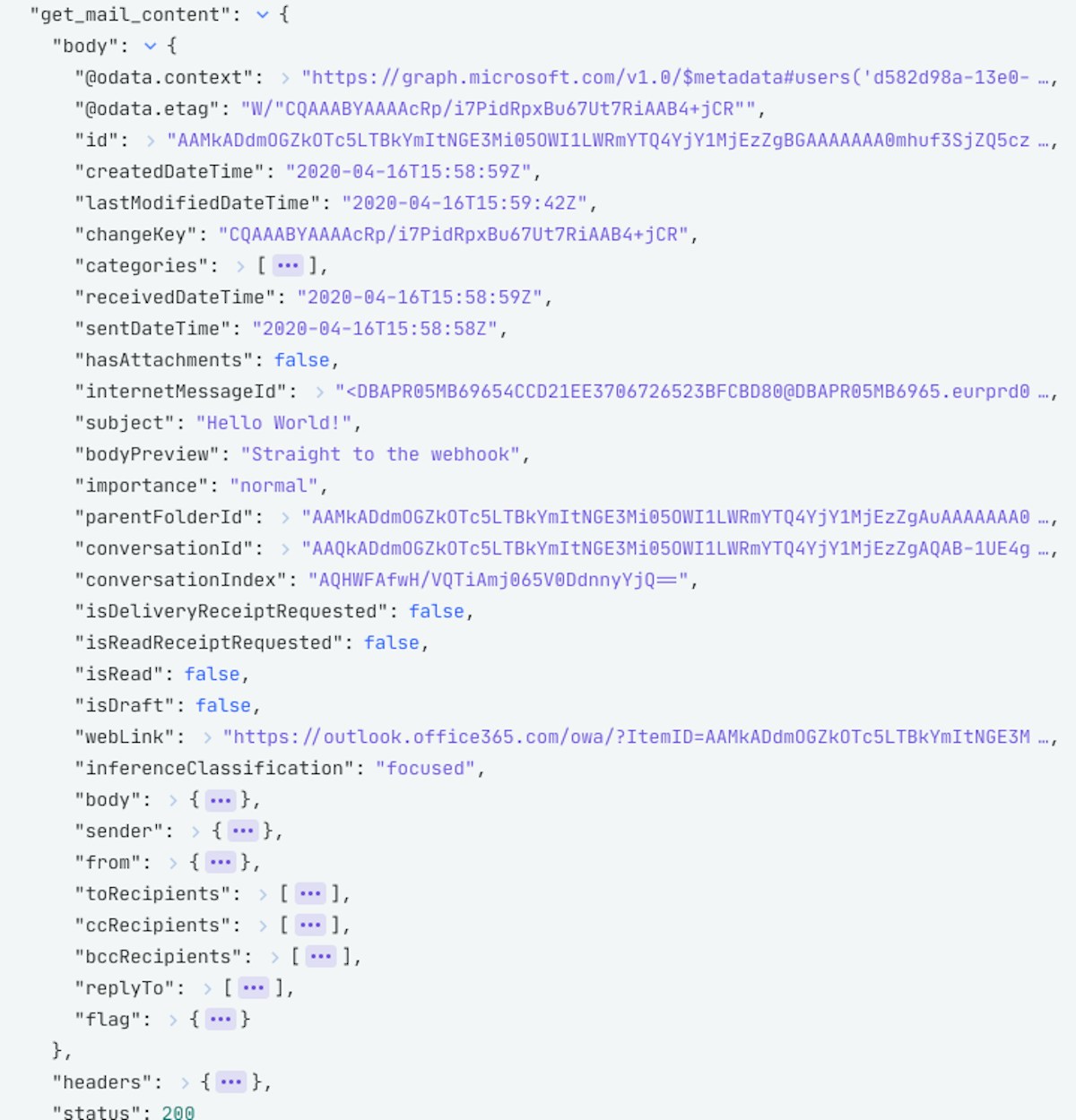 The next time a mail arrives in our chosen inbox, Microsoft will send a notification to the Webhook Action. The notification will look like this: