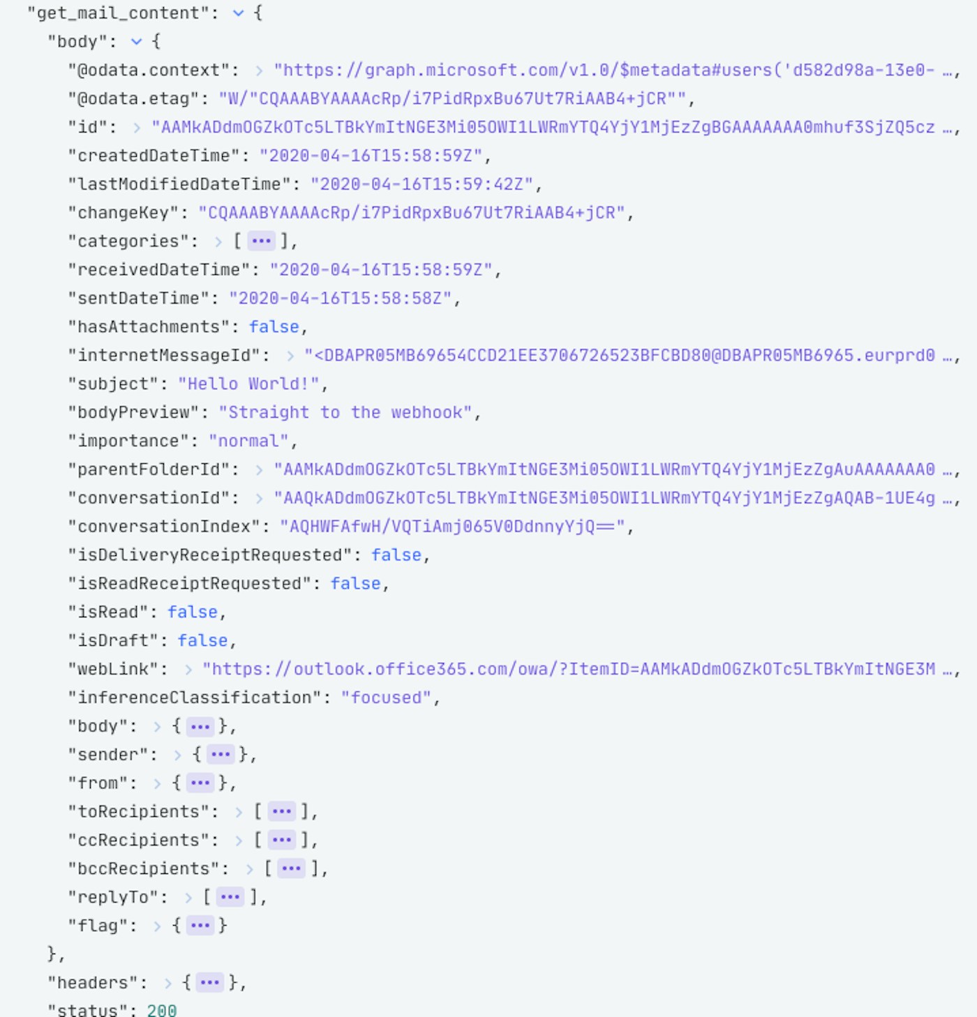 "Authorization": "Bearer {{credential. msgraph }}" } }When that Action receives an event from the previous explode Action, it will use the message ID field to download a JSON formatted email.