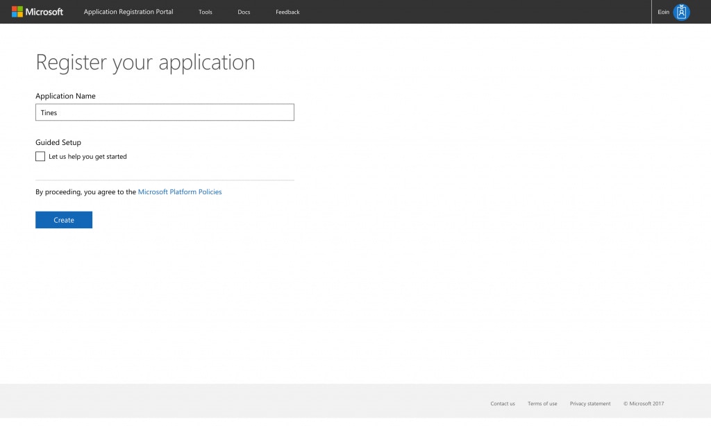 Enter an application name and press “Create”:
