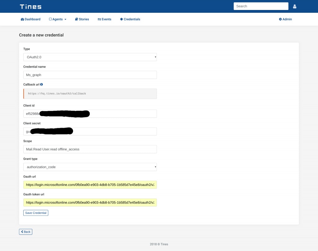 Next, we now need to create a Tines credential that corresponds to the application we’ve just registered. We will use this credential in our Action’s to access Microsoft Graph security data. From your Tines tenant, choose “Credentials” and “New Credential”. From the “Type” dropdown, choose OAuth2.0. Give your credential a name, I used “Ms_graph”, but you can use whatever makes sense in your situation.