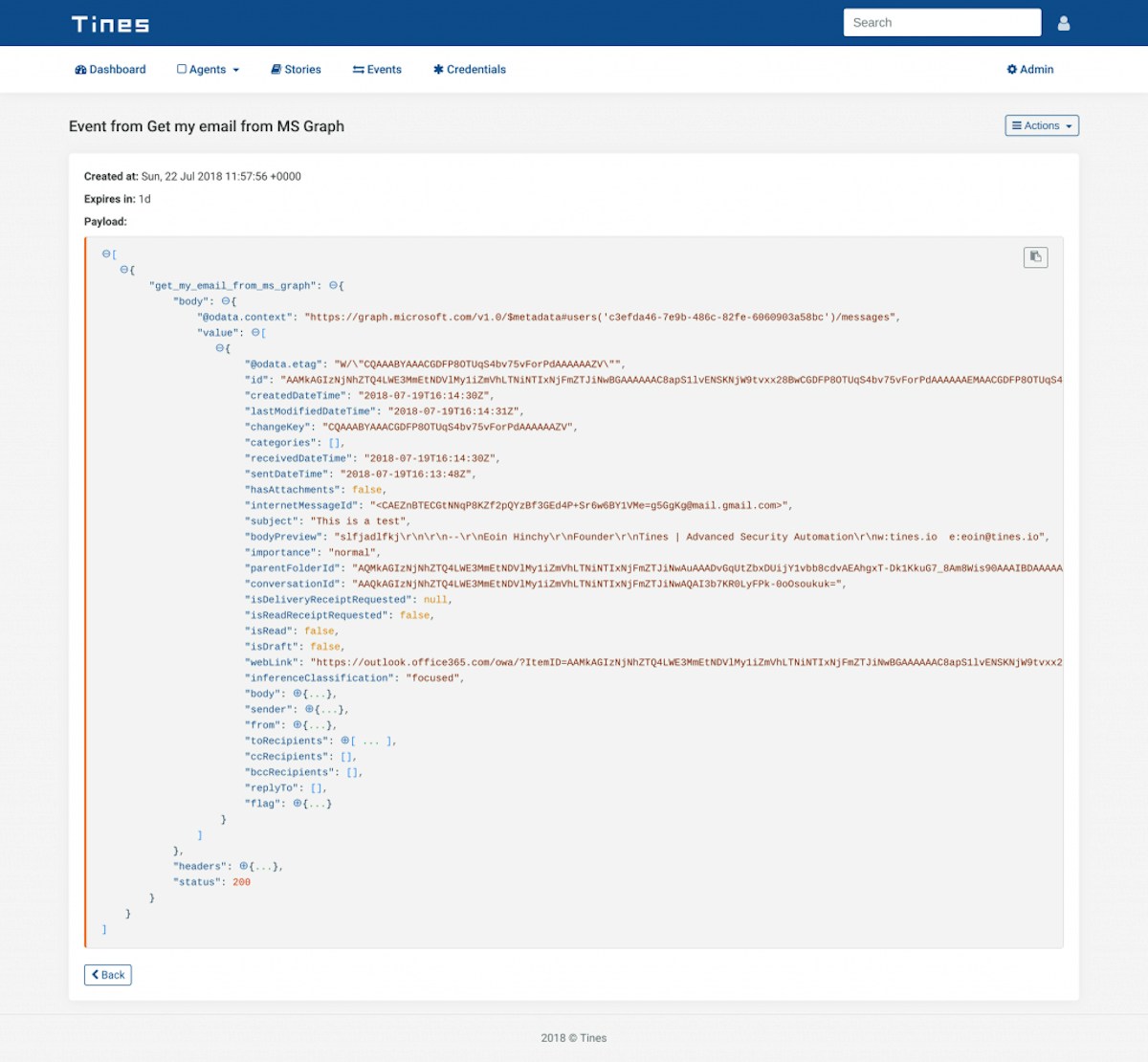 }Consequently, when this Action runs, Tines will replace the credential widget ({% credential Ms_graph %}) with a valid access token. The event emitted by this Action will contain emails from my Outlook inbox. For example: