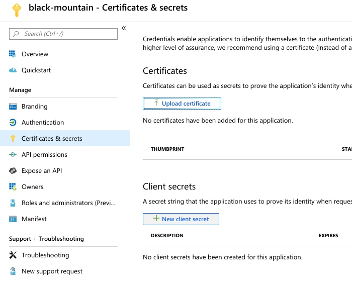 Now create a new application secret using the “Certificates and Secrets” tab.