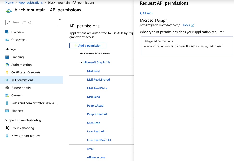 Finally, we need to define the permissions this application should have, this is also referred to as the OAuth2.0 scopes. Permissions include everything from creating tasks to sending emails. A full list of permissions is available in the Microsoft Graph docs.