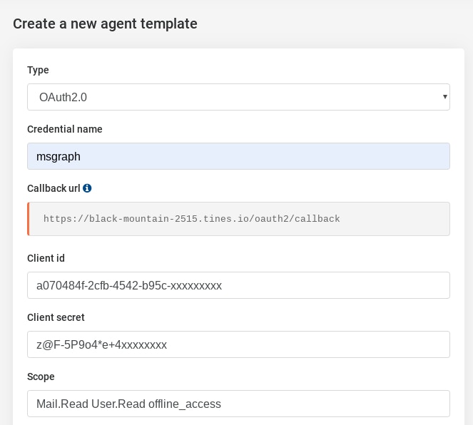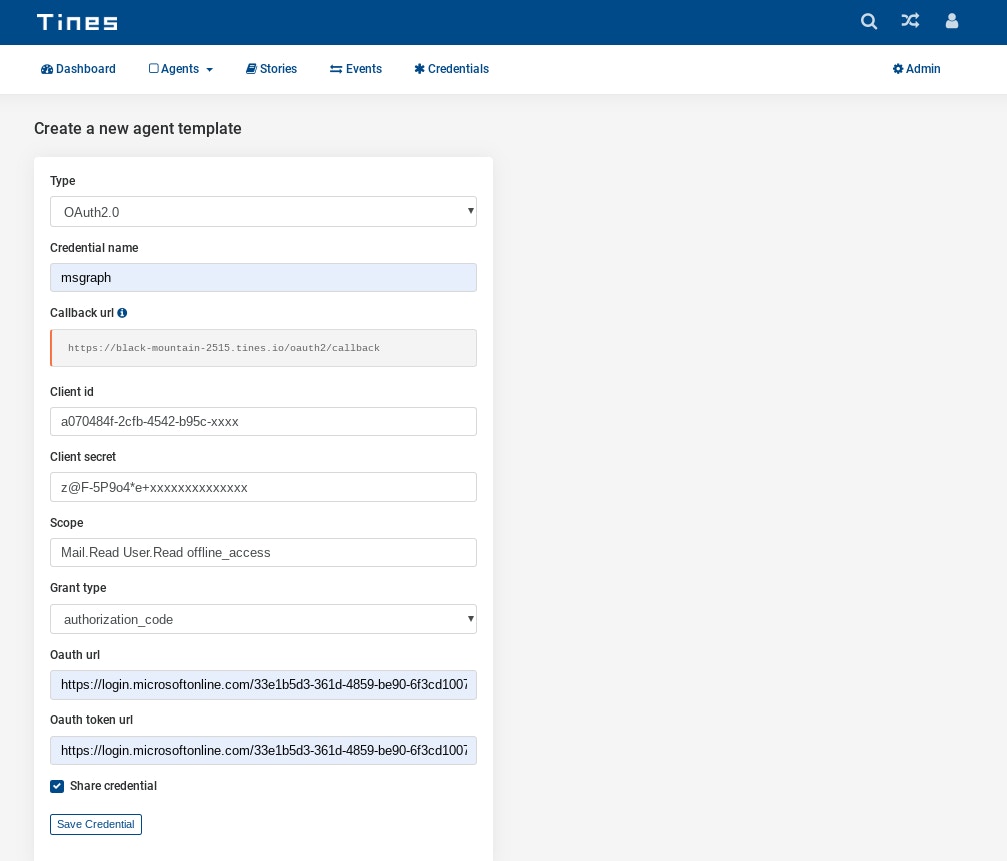 Next, we now need to add these details to the Tines credential so they correspond with the application we’ve just registered. We will use this credential in our Actions to access Microsoft Graph security data. From your Tines tenant, choose “Credentials” and “New Credential”. From the “Type” dropdown, choose OAuth2.0. Give your credential a name, I used “msgraph”, but you can use whatever makes sense in your situation.