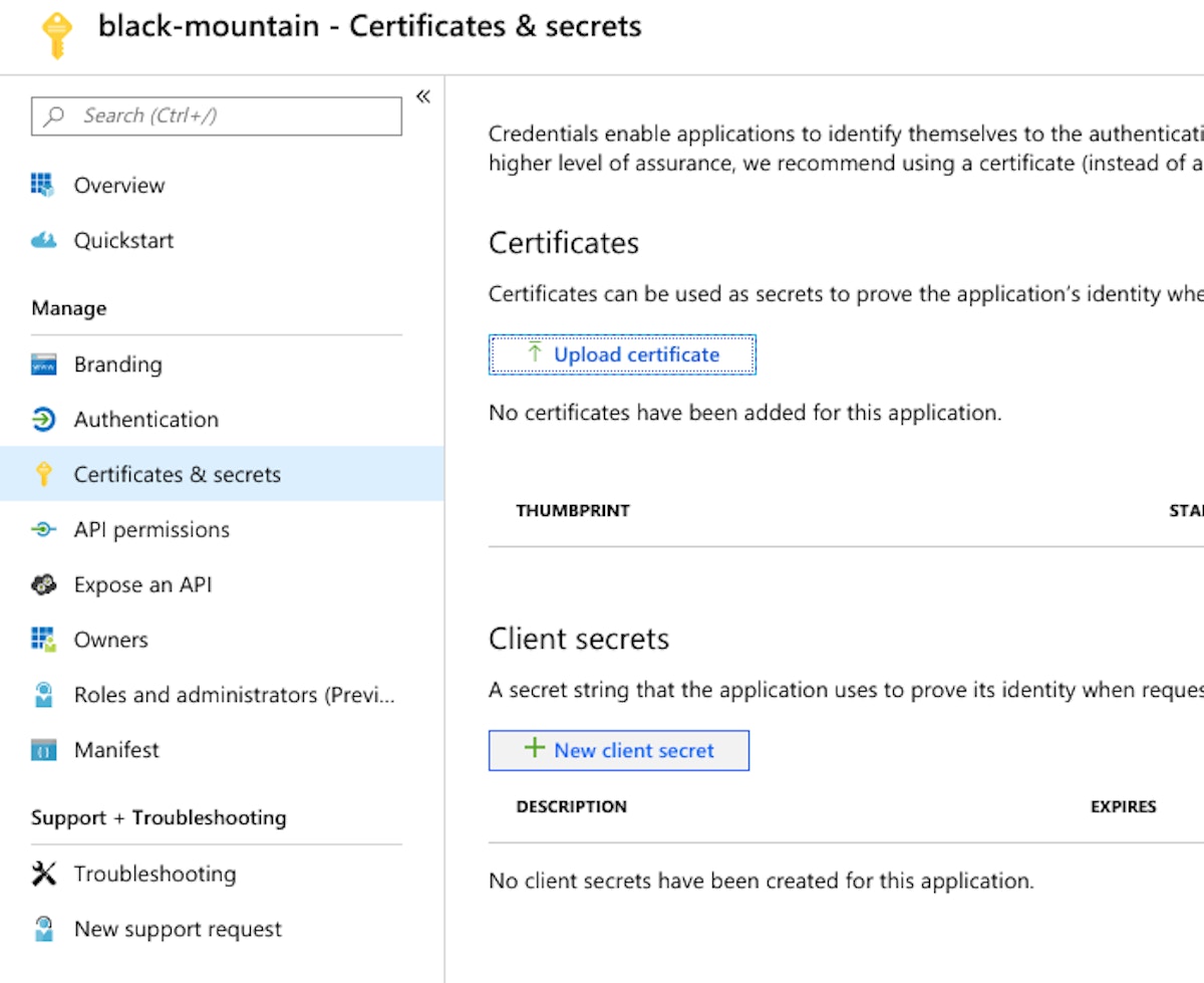 Now create a new application secret using the “Certificates and Secrets” tab.