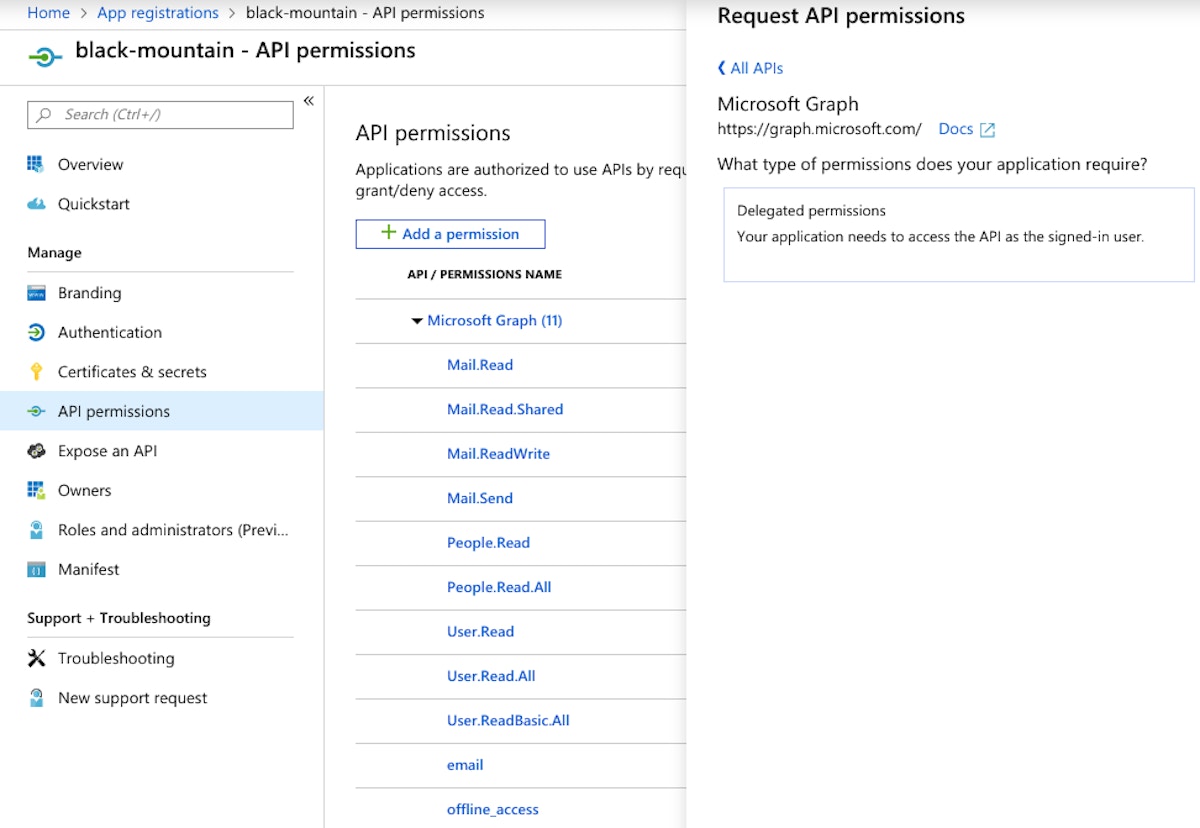 Finally, we need to define the permissions this application should have, this is also referred to as the OAuth2.0 scopes. Permissions include everything from creating tasks to sending emails. A full list of permissions is available in the Microsoft Graph docs.