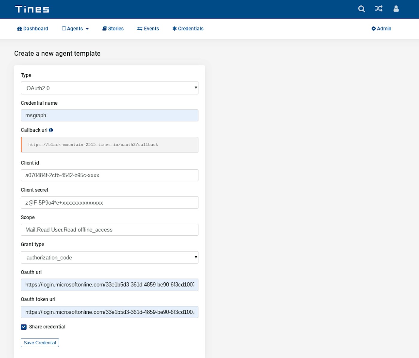 Next, we now need to add these details to the Tines credential so they correspond with the application we’ve just registered. We will use this credential in our Actions to access Microsoft Graph security data. From your Tines tenant, choose “Credentials” and “New Credential”. From the “Type” dropdown, choose OAuth2.0. Give your credential a name, I used “msgraph”, but you can use whatever makes sense in your situation.