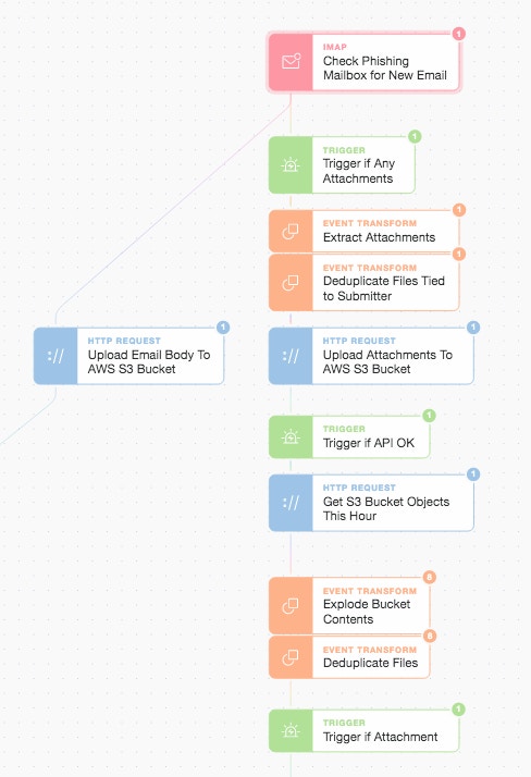 When we upload the attachment to AWS S3 we prefix our object file name with the email Message-ID (we also base64url_encode the Message-ID to get over some AWS S3 special character constraints!). By using the email’s Message-ID as part of the key for the S3 objects we can tie multiple attachments and analyses back to a specific message. We also use the date and hour in the S3 object pathname to make it trivial (and cheaper) to do time-based object retrieval (rather than using the “LastModified” field). This is how the “Get S3 Bucket Objects This Hour” step works above. We then deduplicate subsequent file handling based upon the SHA-265 hash of the file and the submitter’s email address. We also only continue onwards with objects in the bucket that are attachments.