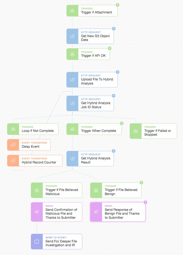 After getting the object we upload the file to Hybrid Analysis and wait for the remote analysis job to complete (in a simple delay loop) and then take action based upon the received threat score. Hybrid Analysis performs multiple checks and has a host of additional metrics and classifications that we could make decisions around what to do next. Irrespective of the analysis outcome, we close the loop with the submitter and thank them for their continued vigilance including confirming whether or not the file they sent actually is benign or malicious. If malicious we explain that it is going on further for deeper investigation and possible Incident Response (IR). This is actioned via another modular Story which could be anything from opening an issue in Jira Service Desk (with pre-populated ticket details and clickable next steps) to parallel automatic submission of the file to a wider array of anti-malware engines. It all depends on how you want to model and automate your workflow, playbook, or SOP (Standard Operating Procedure) as you can easily perform a whole host of actions either linearly or in parallel.