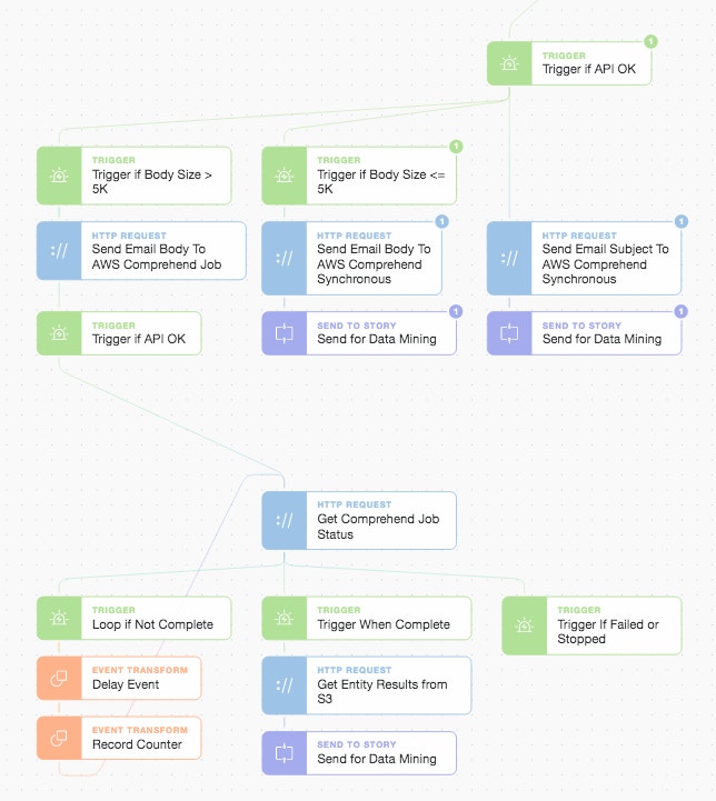 Simple operations, when joined together, have a habit of complicating themselves but it needn’t be so. Abstraction is a way of hiding complexity while simplifying engagement. Oversimplification can result in a loss of detail but not when you retain the capability to go deeper when needed. So, in the following Story, we will focus on one main analysis thread while also leveraging AI on the side for longer-term, deeper semantic analysis. We will also highlight how to modularize workflows using the STS (Send To Story) feature as an egress point from our main Story.