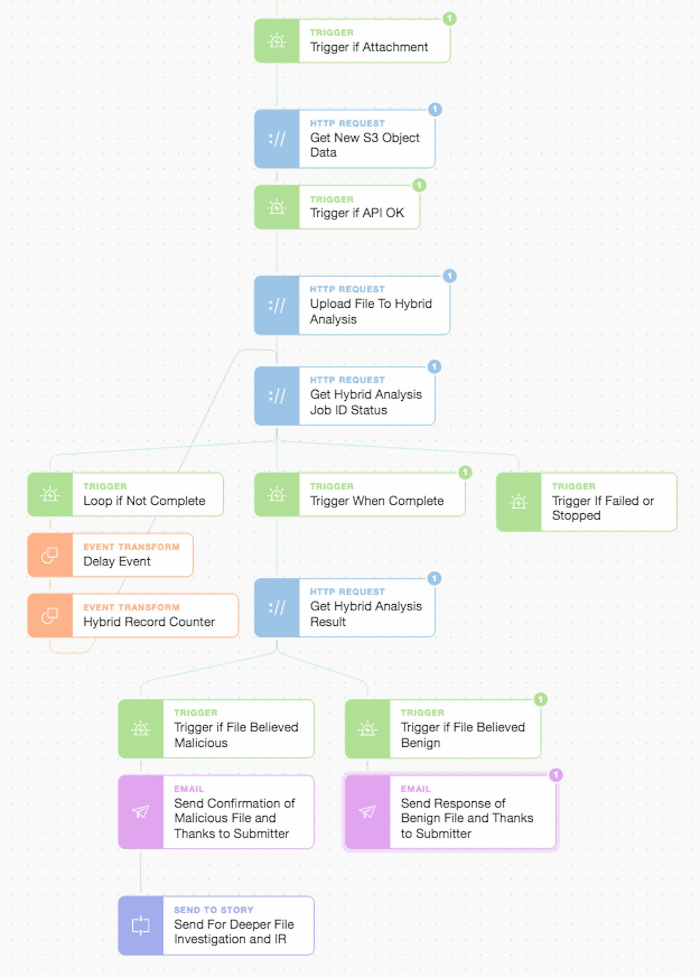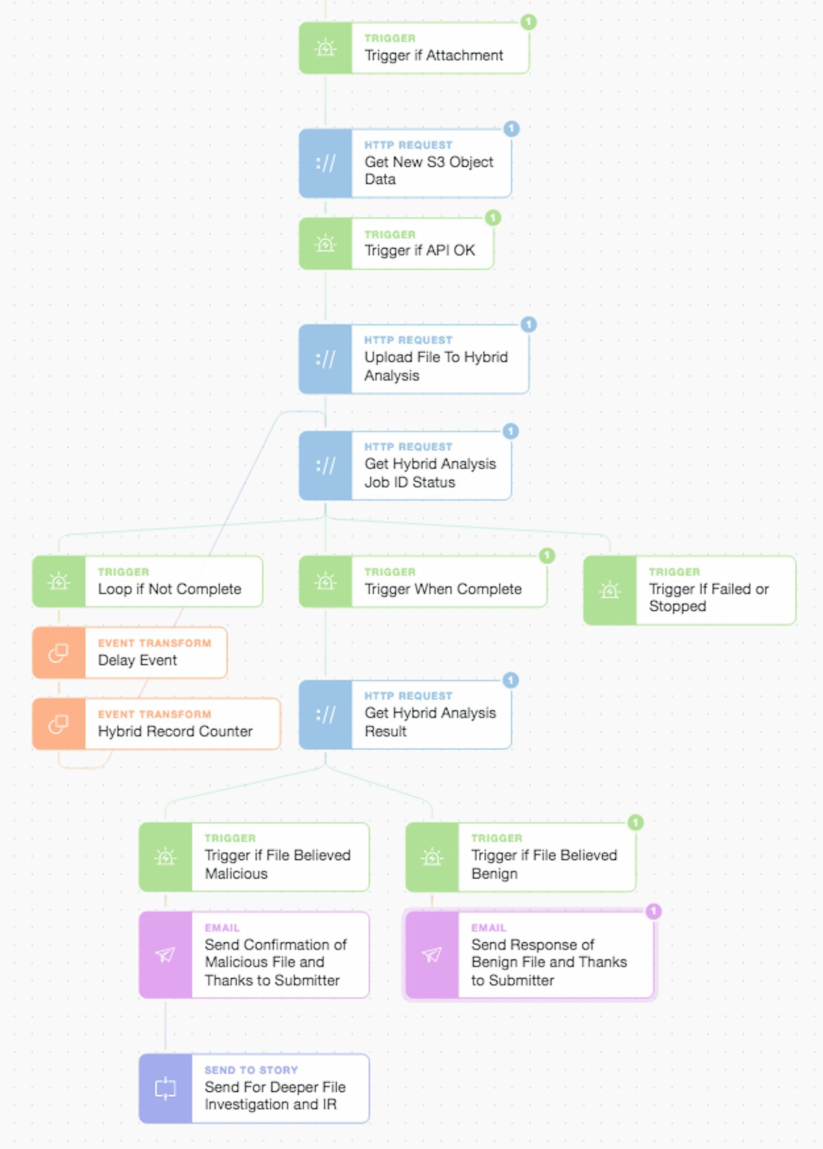 After getting the object we upload the file to Hybrid Analysis and wait for the remote analysis job to complete (in a simple delay loop) and then take action based upon the received threat score. Hybrid Analysis performs multiple checks and has a host of additional metrics and classifications that we could make decisions around what to do next. Irrespective of the analysis outcome, we close the loop with the submitter and thank them for their continued vigilance including confirming whether or not the file they sent actually is benign or malicious. If malicious we explain that it is going on further for deeper investigation and possible Incident Response (IR). This is actioned via another modular Story which could be anything from opening an issue in Jira Service Desk (with pre-populated ticket details and clickable next steps) to parallel automatic submission of the file to a wider array of anti-malware engines. It all depends on how you want to model and automate your workflow, playbook, or SOP (Standard Operating Procedure) as you can easily perform a whole host of actions either linearly or in parallel.