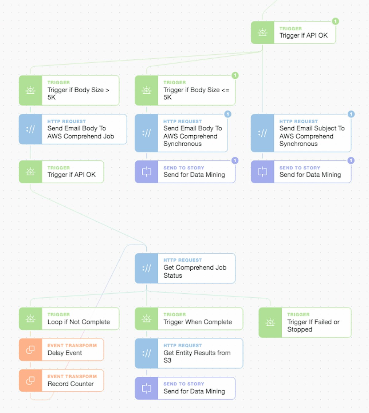 While the main central file storage and analysis workflow was executing we began to perform NLP (Natural Language Processing) on the subject and body of the email to extract entities from their text. Dependent upon the size of the email body we request either a synchronous or asynchronous analysis job from AWS Comprehend.