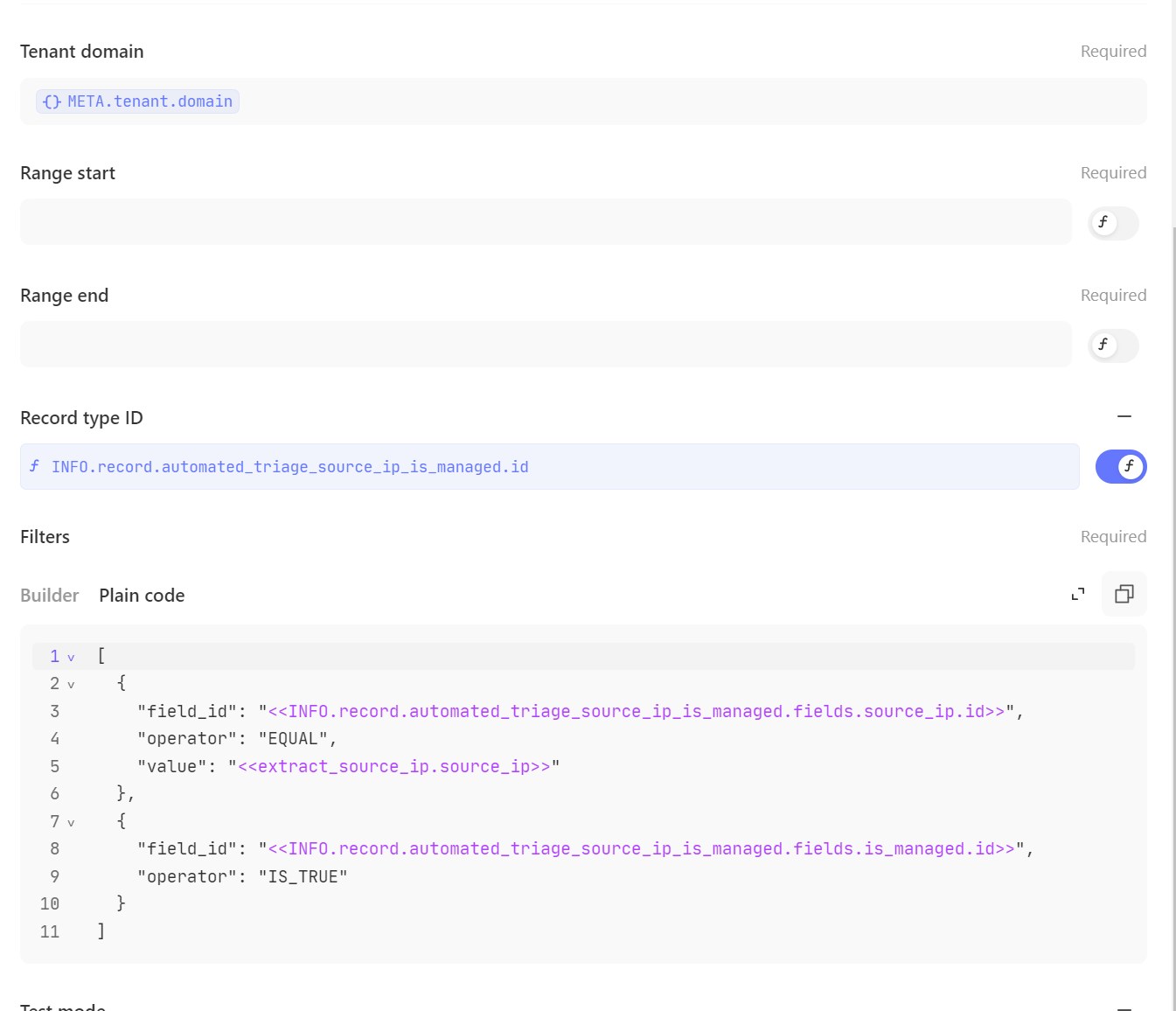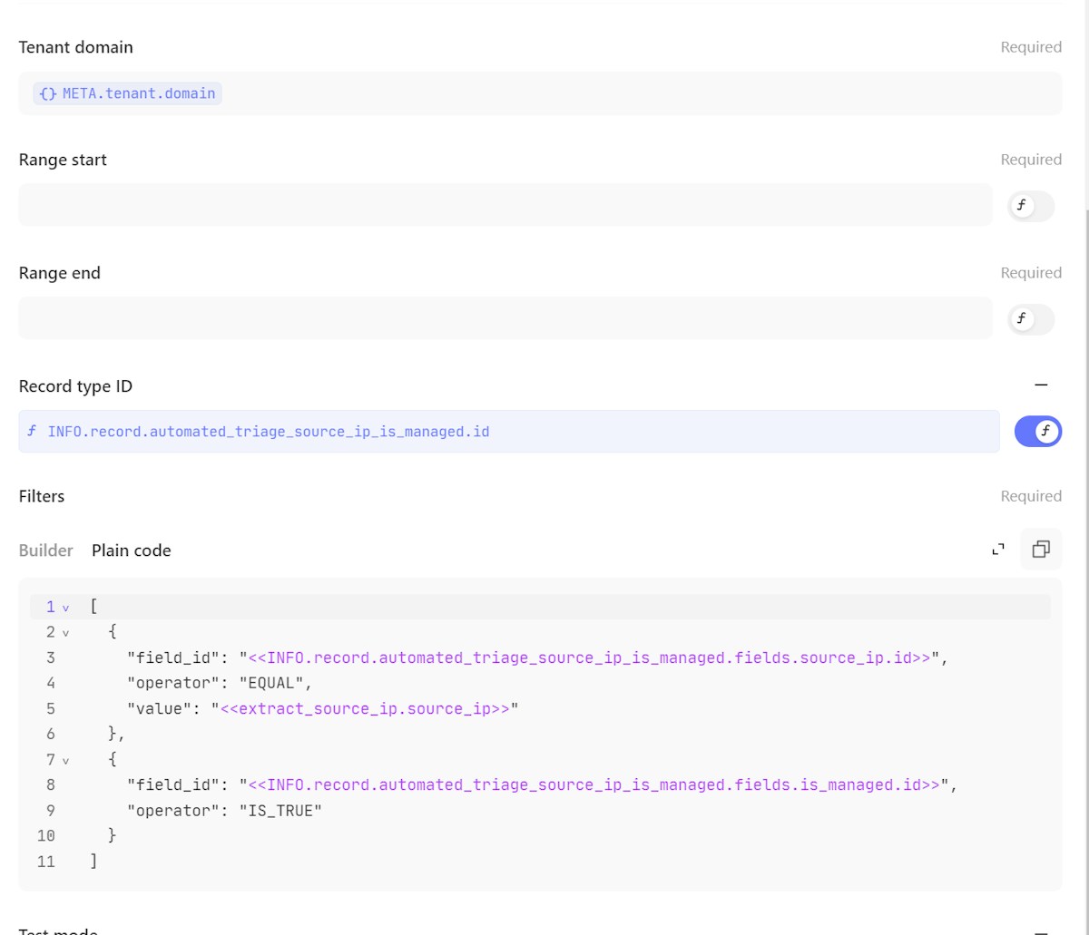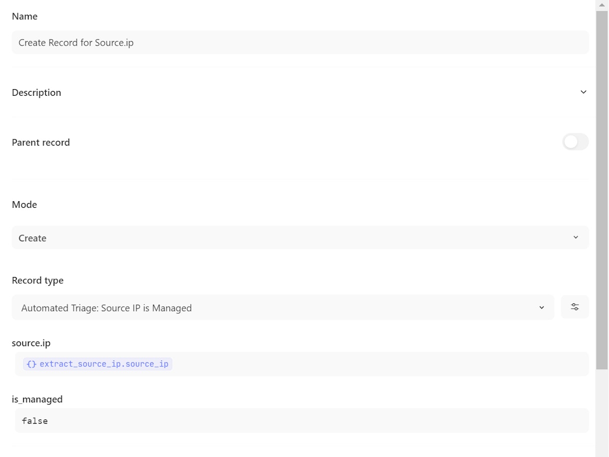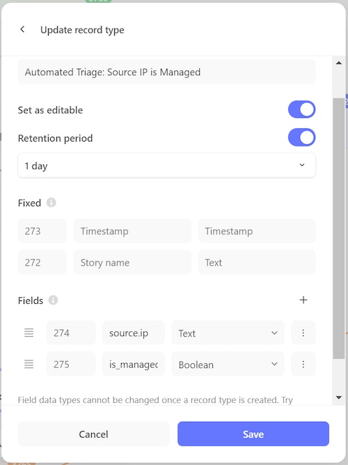 For this workflow, we use a record containing two fields, a source.ip text field, and a boolean field called is_managed that we set to true if a source.ip belongs to a system that we manage. We set the record to "editable" so we can update the fields based on the results of our story. We also set the retention period to one day, this will delete all older records, which saves space on our tenant, and forces a re-check of a source.ip once per day.