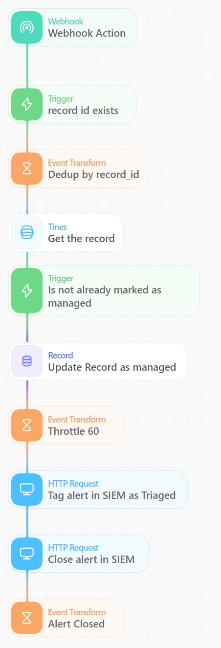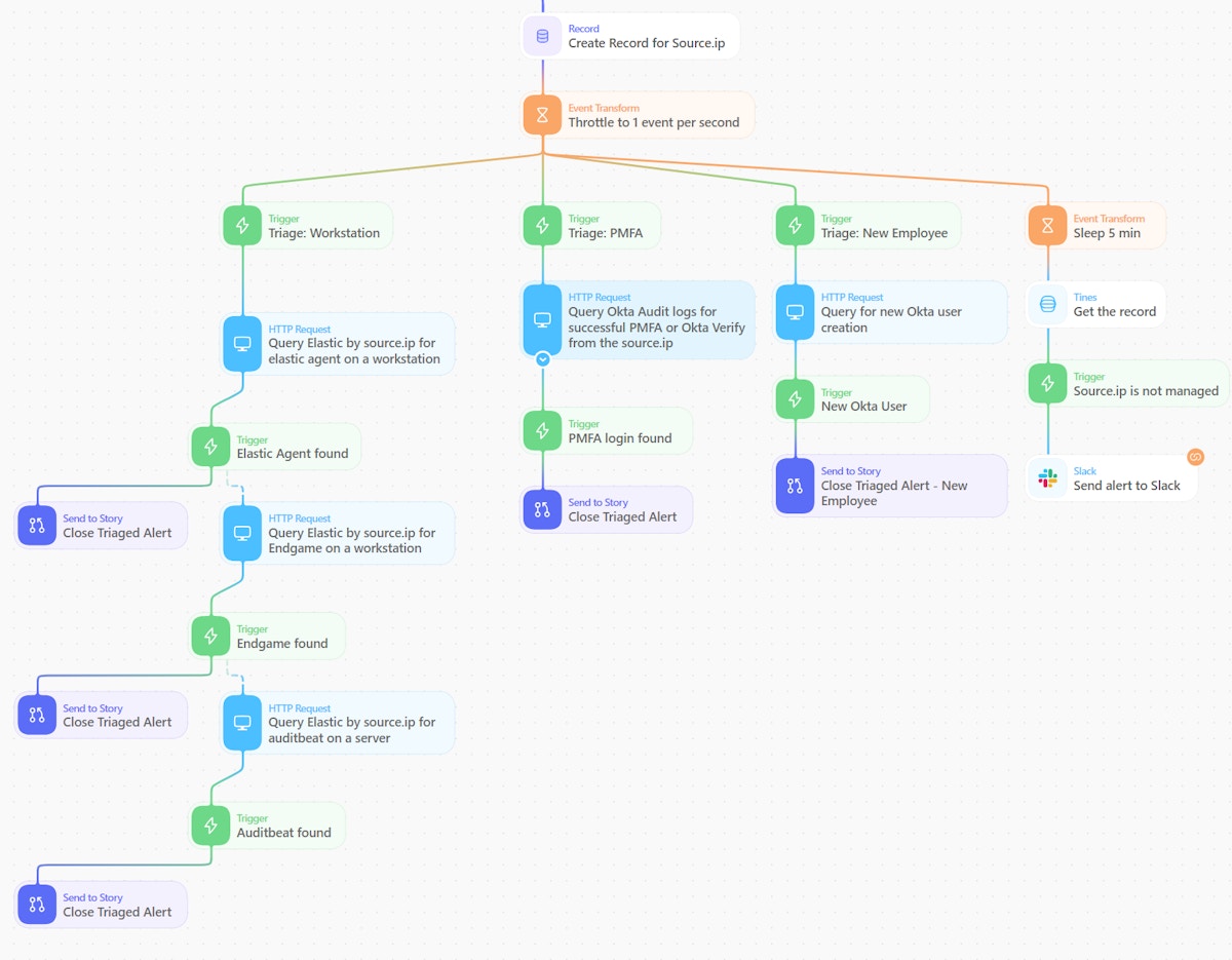 Before the alerts are triaged, we check to see if a record already exist for that source.ip and if it's been marked as managed. If it has, the source.ip is a known good and we can close the alert and skip all of the following actions. This dramatically reduces the load on our tenant and our Elasticsearch clusters from unnecessary queries.