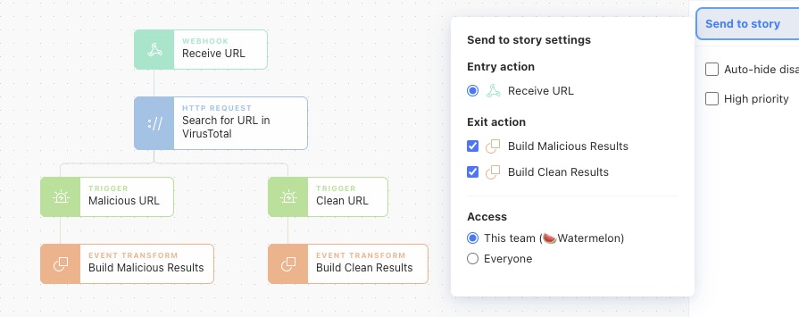 One of the first improvements we released is the ability to set multiple 'Exit Actions' for a Send to Story. This capability allows for a 'child' Send to Story to take multiple complex forks without the need to return to a single action in order to return results to the 'parent' story, which was a previous requirement. This allows for returning specific pieces of information based on the findings in the fork, like in the example below, where either a clean or malicious result would be returned along with additional pieces of data which led to that verdict.