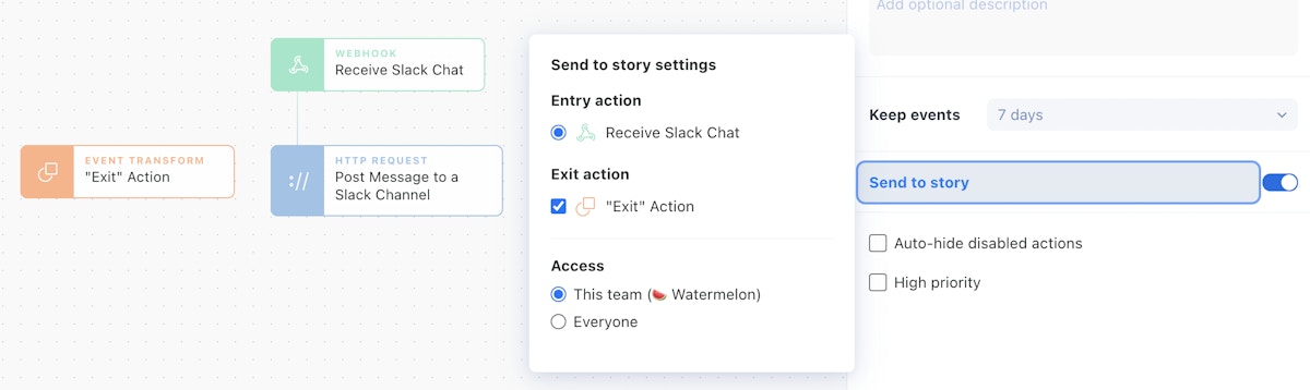 Last up, while Send to Story requires an Event Transform action to be on the storyboard and configured as an exit action in the Send to Story configuration, that exit action is not required to be connected to any other actions. This results in a Send to Story which can end a fork for a 'parent' workflow. This is helpful if nothing needs to be returned to the 'parent' story and the 'child' story can, like in the example below, just send a Slack message and finish the fork in the workflow.