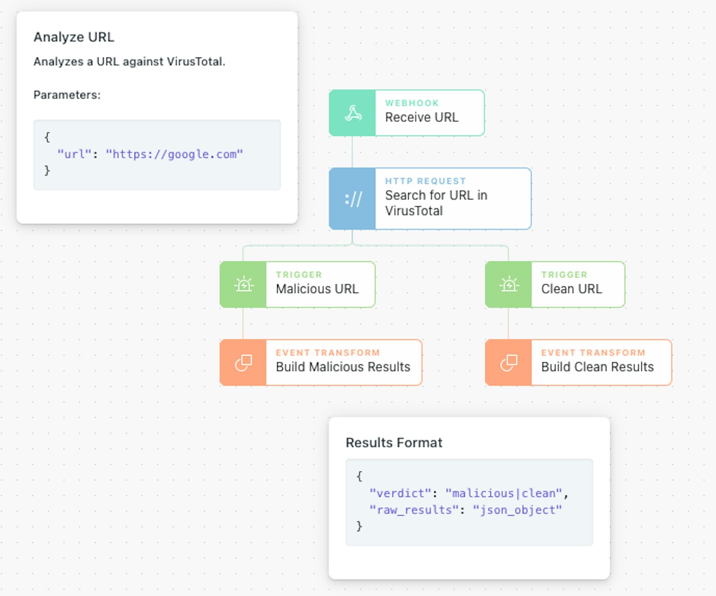 Standardizing on a return format across multiple exit actions helps with managing the Send to Story from many other stories. It can also be helpful to always return a form of unmodified data payload back to the calling story in addition to a calculated response ('malicious' or 'clean' in the example above) in case the 'parent' story needs additional context for further action.