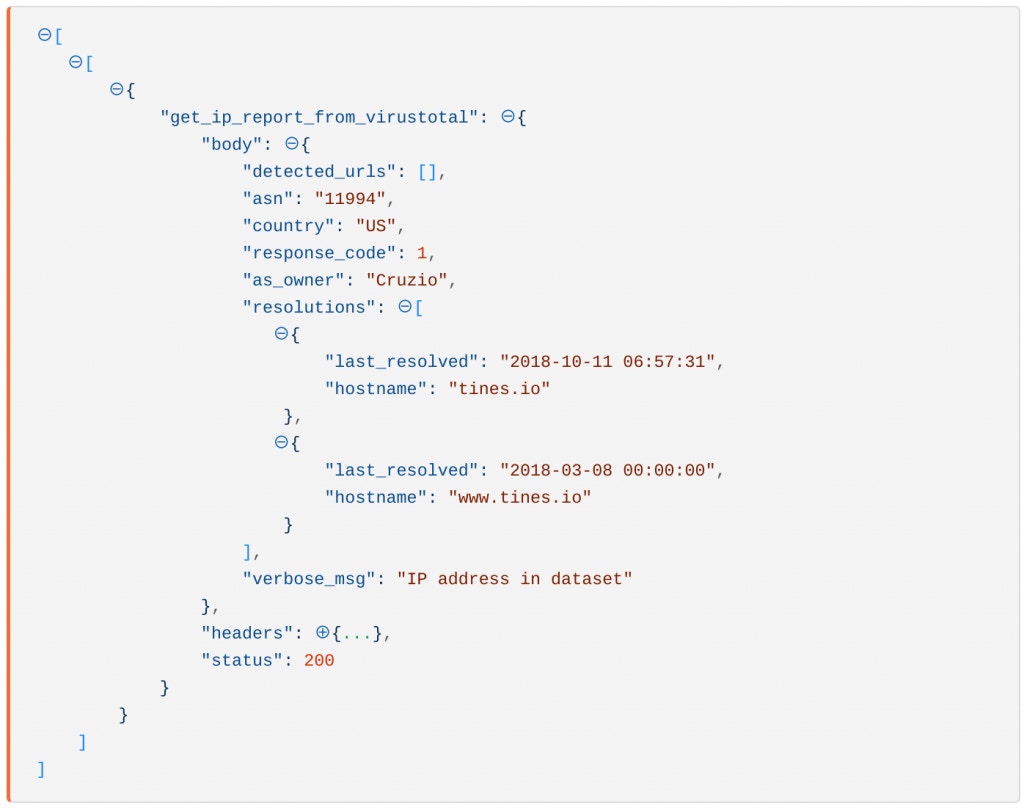 }In this case, we’re using the GET method and calling the /ip-address/report endpoint. When the Action runs, it will emit the response from the VirusTotal API as a new event. See the sample emitted event below: