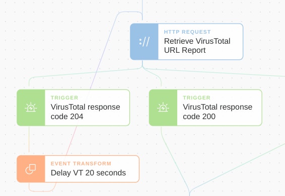In the diagram below, we use an HTTP Request Action to query the VirusTotal API, then check whether the response hit a rate limit. If it did, that is the status was 429, we wait 20 seconds and try again.