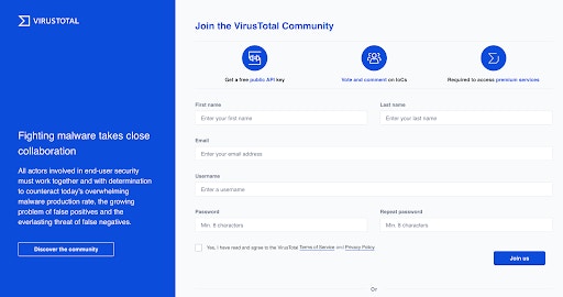 Access to the VirusTotal public API is free, to get started, you’ll need to obtain an API key. The API key allows you to make queries against the API. Click “Join our community” on the virustotal.com home page. Enter the required details and click “sign-up.”