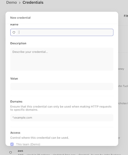 The Tines credential widget allows storage of secret information so it can be safely included in Action bodies, without fear of disclosure. To add your VirusTotal API key to Tines, when signed in to a tenant, choose “Credentials” -> “New Credential”.