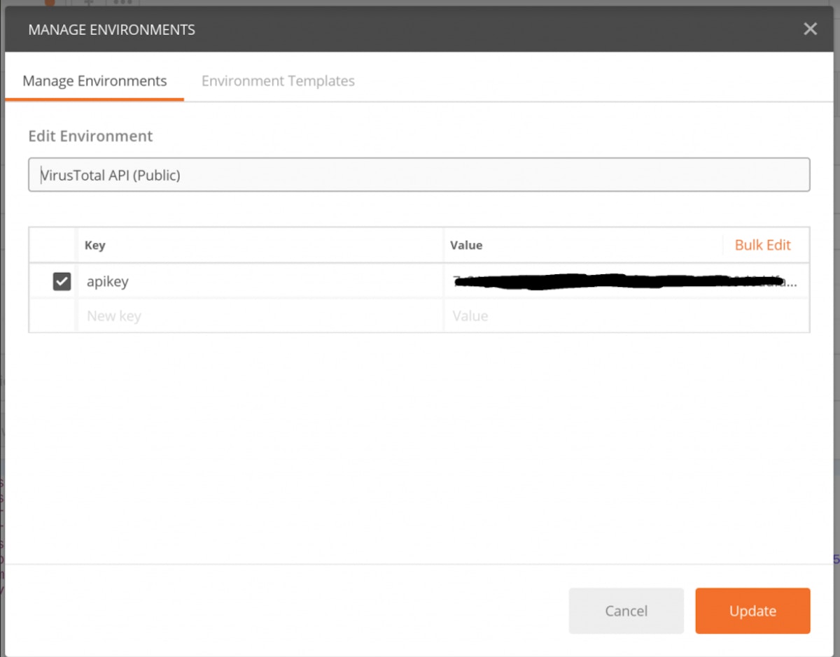 After you have imported the Postman collection, create a new environment variable called “apikey”. Next, store your VirusTotal API key in this variable (see below).