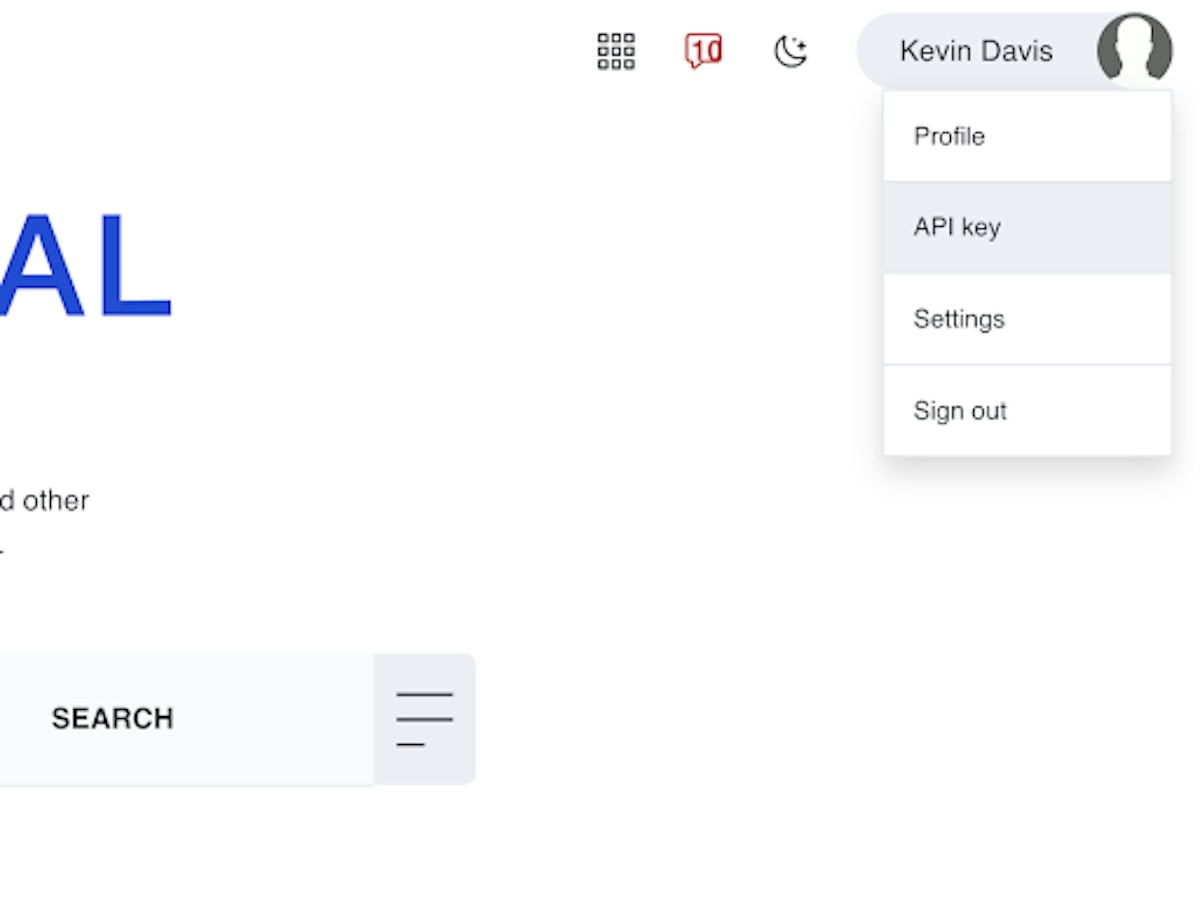 After you’ve created your account, click your username in the top right-hand corner of the page. Then, from the drop-down menu, select “My API key.”