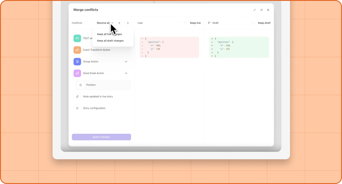 “Resolve all” is a new dropdown option we added to the change request modal. When lots of small changes are made to a story, this new option lets you accept all pre-discussed story changes at once, bypassing the need for individual review.