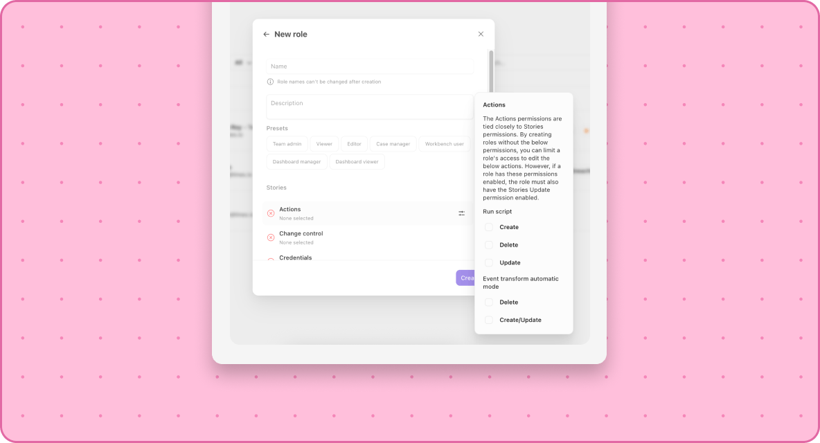 These actions include Run Script and Event Transform, so to improve the security around their usage, we added permissions to limit the ability to create/delete/update a Run Script or Automatic mode action.