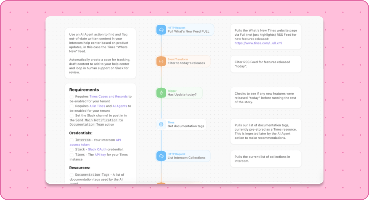 Tines hosted an AI hackathon recently, with the Content Review Bot awarded the winner. This bot speeds up how we create and update our product content by tracking product releases from our What’s New page.
