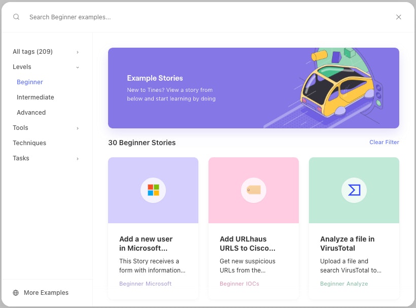 You will be greeted with a page that shows off our built-in Story Library. Here, you have access to an ever growing set of pre-built Tines stories for a variety of use cases and tools, available for instant import to your tenant. Driven by our community and internal teams, this set of stories is constantly evolving, so if you have some ideas for it, let us know!