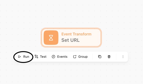 Run it from the top! Click on “Set URL” and click “run” in the context menu to run the story. Notice that the event counter in the top right corner is incremented and now there is an event in “Submit URL to URLScan.io”