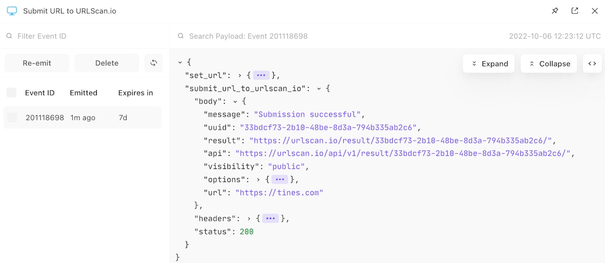 Click on the event counter on “Submit URL to URLScan.io” to go straight to the Events pane for that action