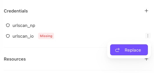 Hover over the urlscan_io credential that is labeled as “missing” and click the kebab menu to the far right, then click “Replace”