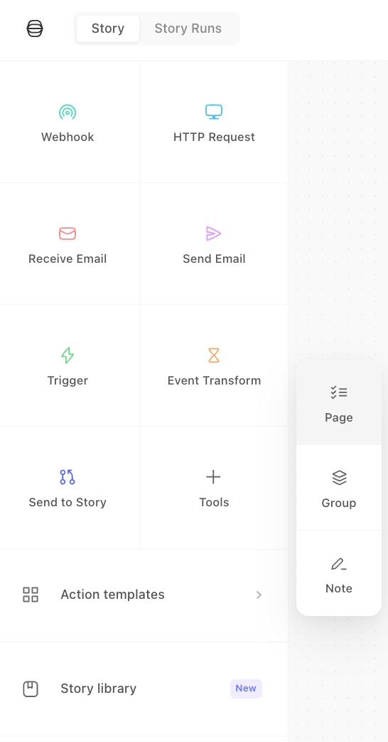 In the left side bar, hover over "Tools". Click and drag a "Page" onto the story board at the top of your story.
