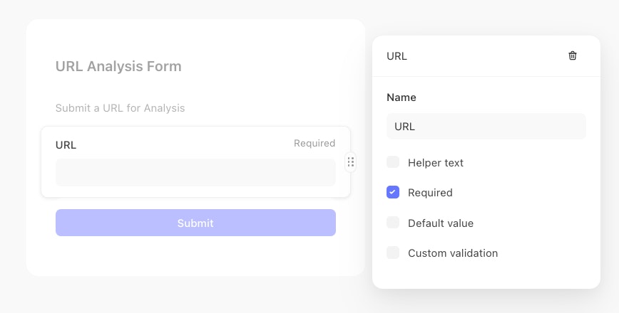 Upon adding the "URL" element, you can customize the Name, and set an optional Description. Name this field “URL” and check the box to make this a required field.