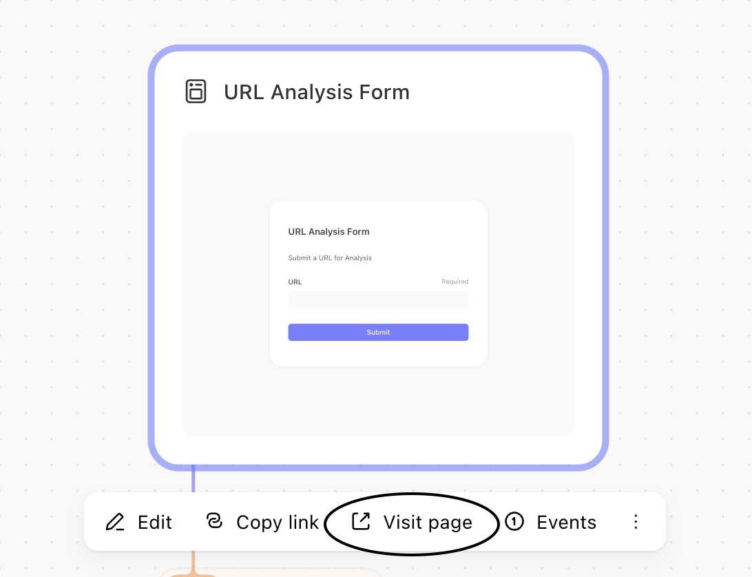 Select the "URL Analysis Form" Page at the top of our story and click on "Visit Page" in the context menu that appears, as we did previously. Fill out your form and click submit. Now wait for the analysis to complete and view the results from the Page!