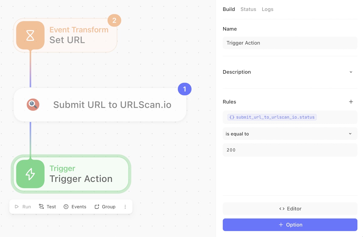 This trigger is checking that the “status” field returned from your Submit URL to URLScan.io action is equal to 200, which indicates a successful return. Now, only events that match this trigger will flow further in the story.
