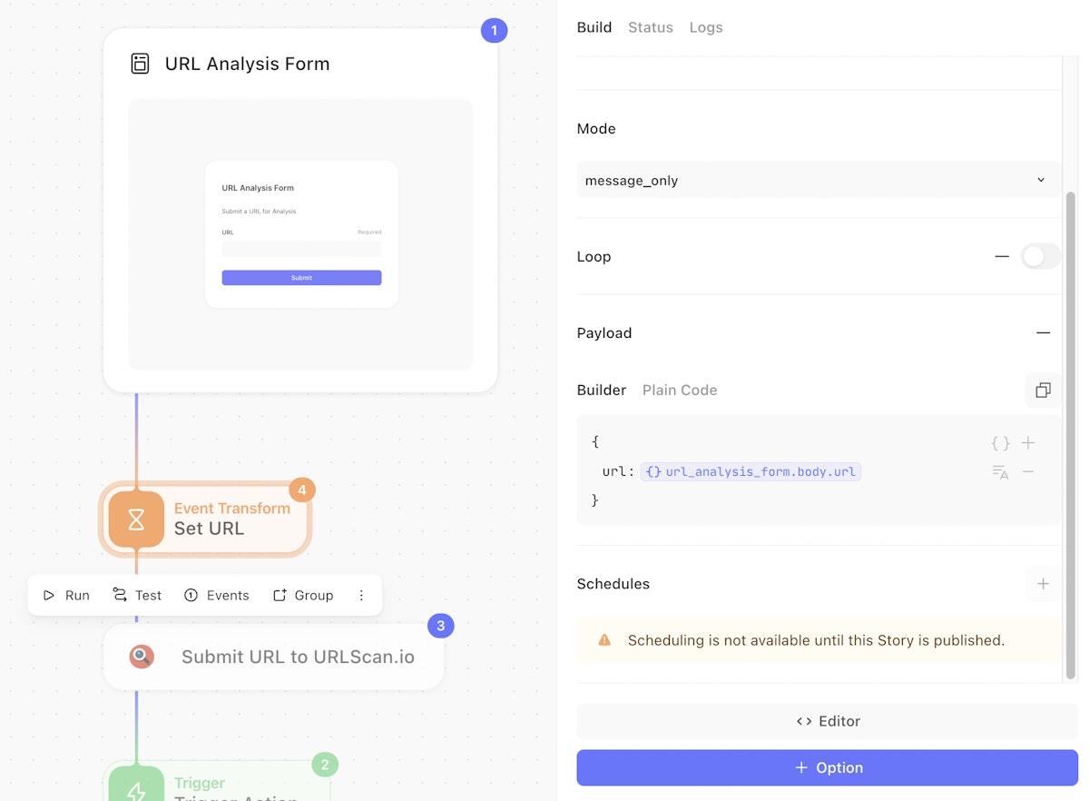 Today, you will be building a story that allows you to submit a URL to URLscan, wait for the scan to complete, and then retrieve the results. After retrieving the results, you will format the results and send them via email.