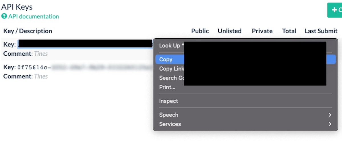 Hover over the API key to view it, highlight it and copy, taking care not to also copy "Key:"