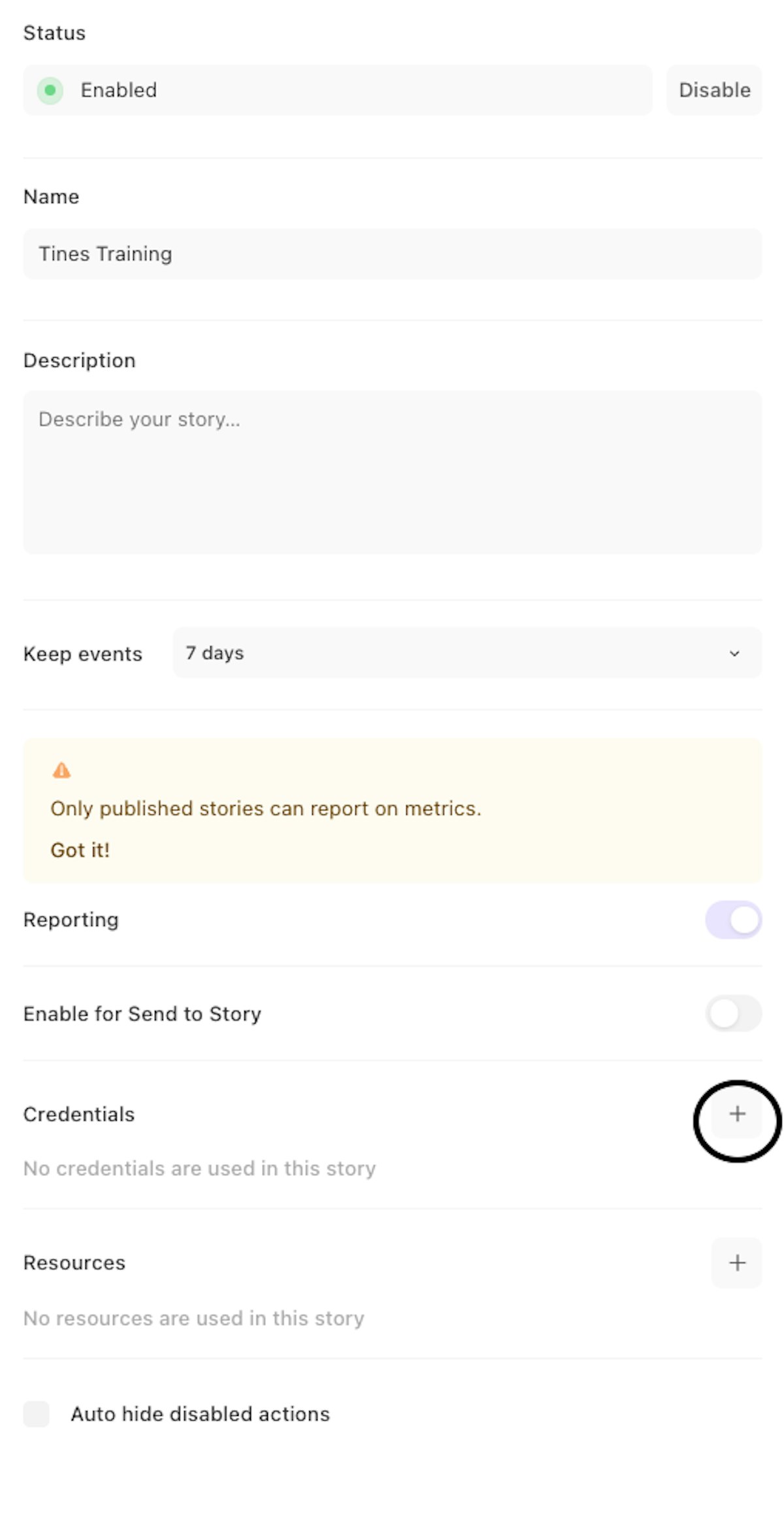 In the popout, click on “Text”, but note the different types of credentials that one can create in Tines.