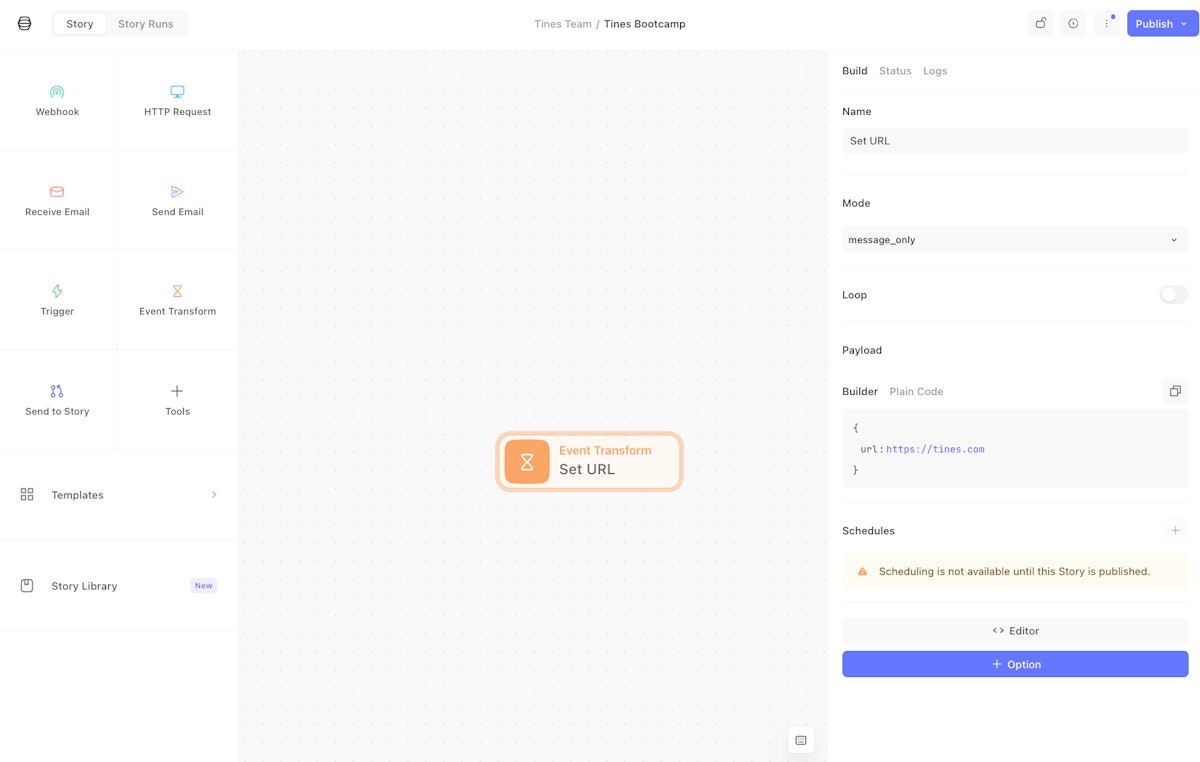 Tines exists to empower people to automate work without needing coding knowledge. The goal of this bootcamp is to introduce new users to some of the core concepts of Tines. We will walk you through creating a simple URL analysis story. By the end, you should be comfortable enough to build your own story from scratch and have a new understanding of how you could reclaim valuable time by automating your repetitive workflows.