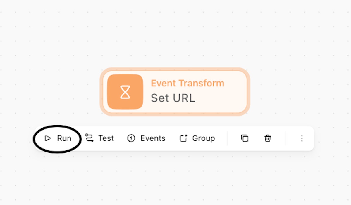Run it from the top! Click on “Set URL” and click “run” in the context menu to run the story. Notice that the event counter in the top right corner is incremented and now there is an event in “Submit URL to URLScan.io”