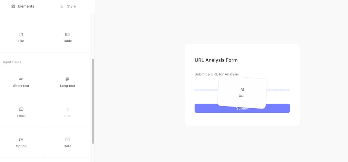 Now, click and drag the URL element in the left pane and position it where you would like it on the Page. In the following image, I have moved it to be above the "Submit" Button.