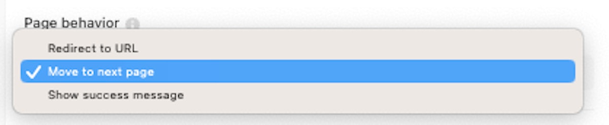 With the Page selected, on the right pane, you can set the action this Page will take On Submission. In the "Page behavior" field, click the drop-down, and change this to "Move to Next Page"