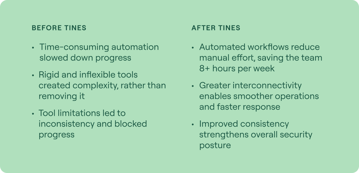 Tines hasn’t just helped streamline operations, it’s also made it easier for the team to experiment and innovate.