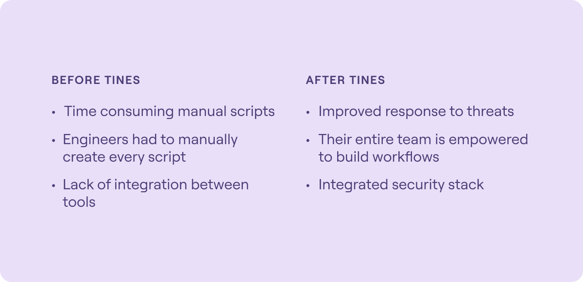 According to Andrew, “Tines has helped us scale by letting us step away from the burden of running and operating many disparate tools, and also the burden of having to adjust and marry up the output of many disparate tools that had been created over months and months and years of the team growing.”