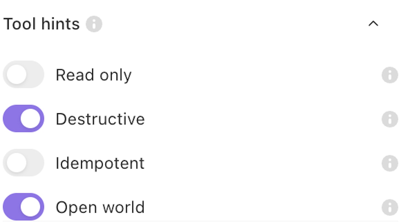 Each tool in an MCP server can include optional annotations that describe its behavior to MCP clients. These hints help clients make decisions about how and when to invoke tools.