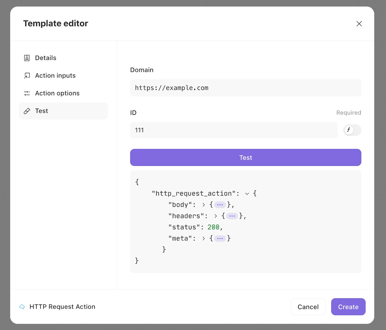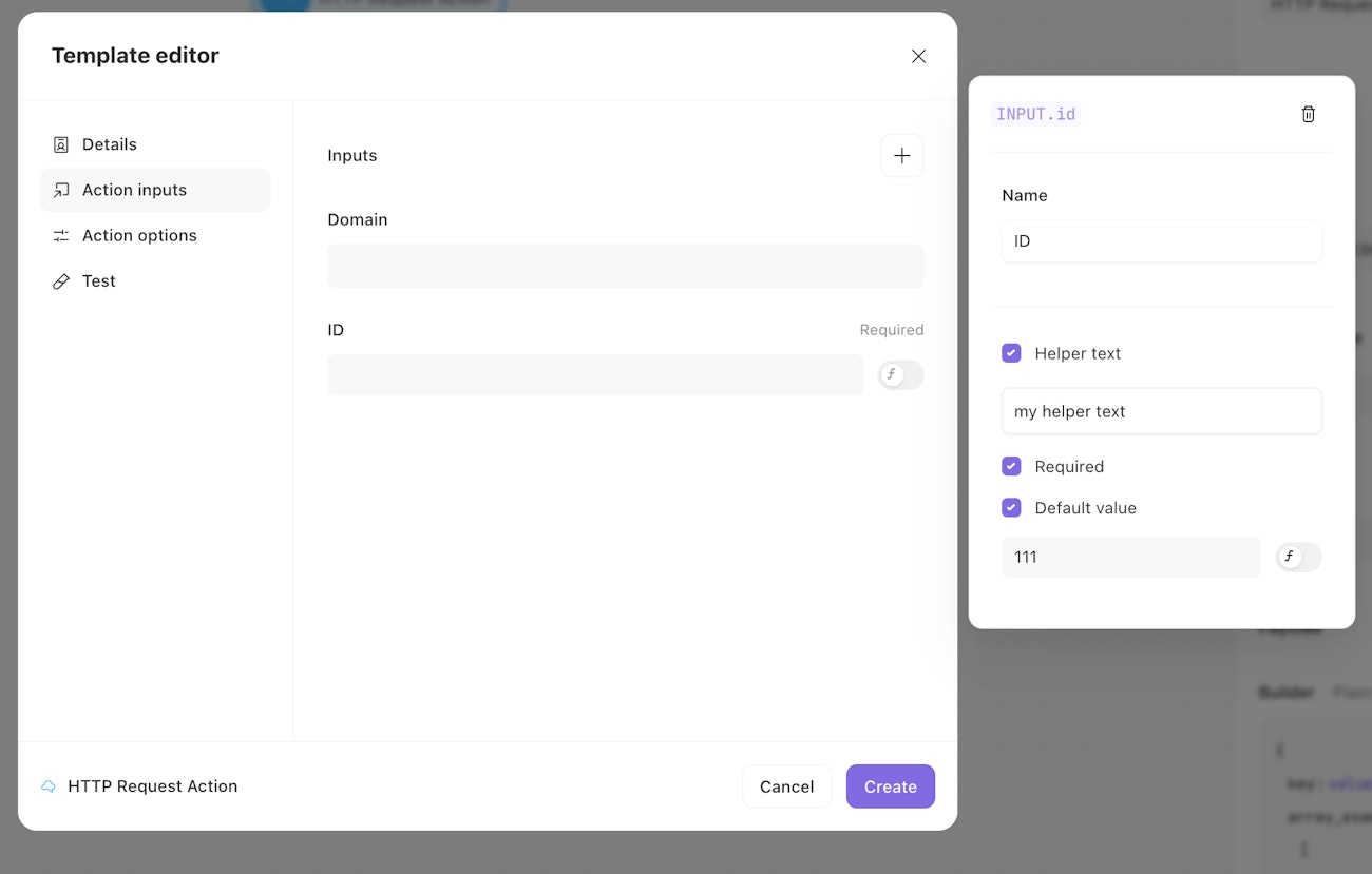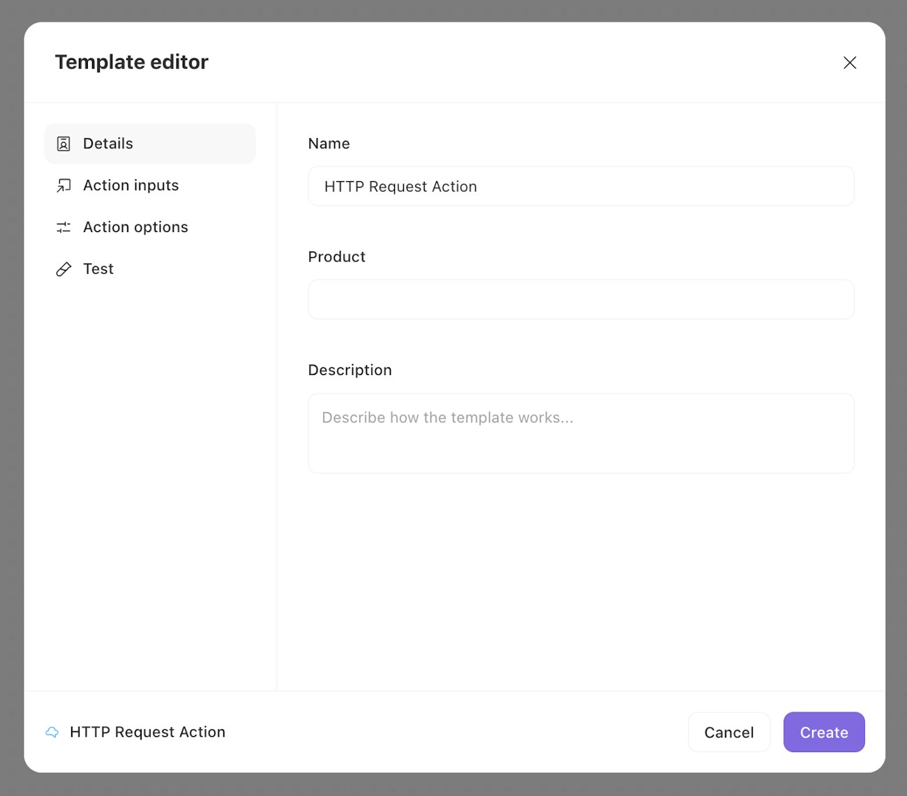 To create a private template, select any action from any story and then select Create template from the more dropdown to open the template editor. The editor will autofill any information from the selected template and is broken up into four sections: Details, Action inputs, Action options and Test.