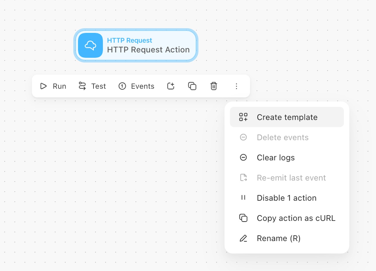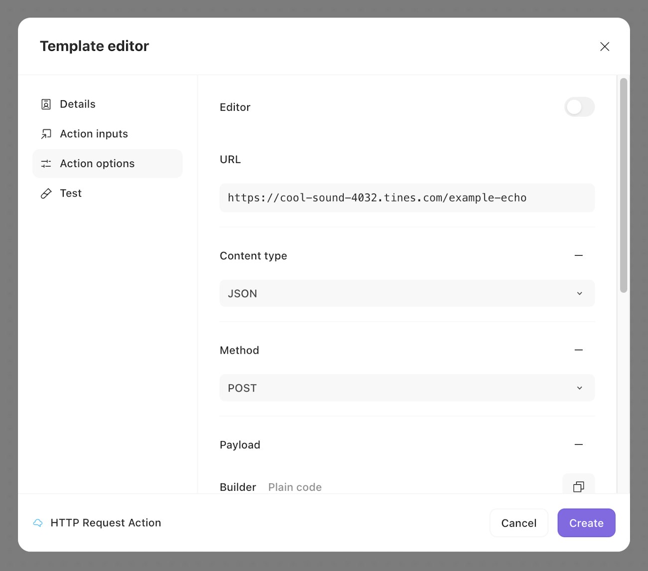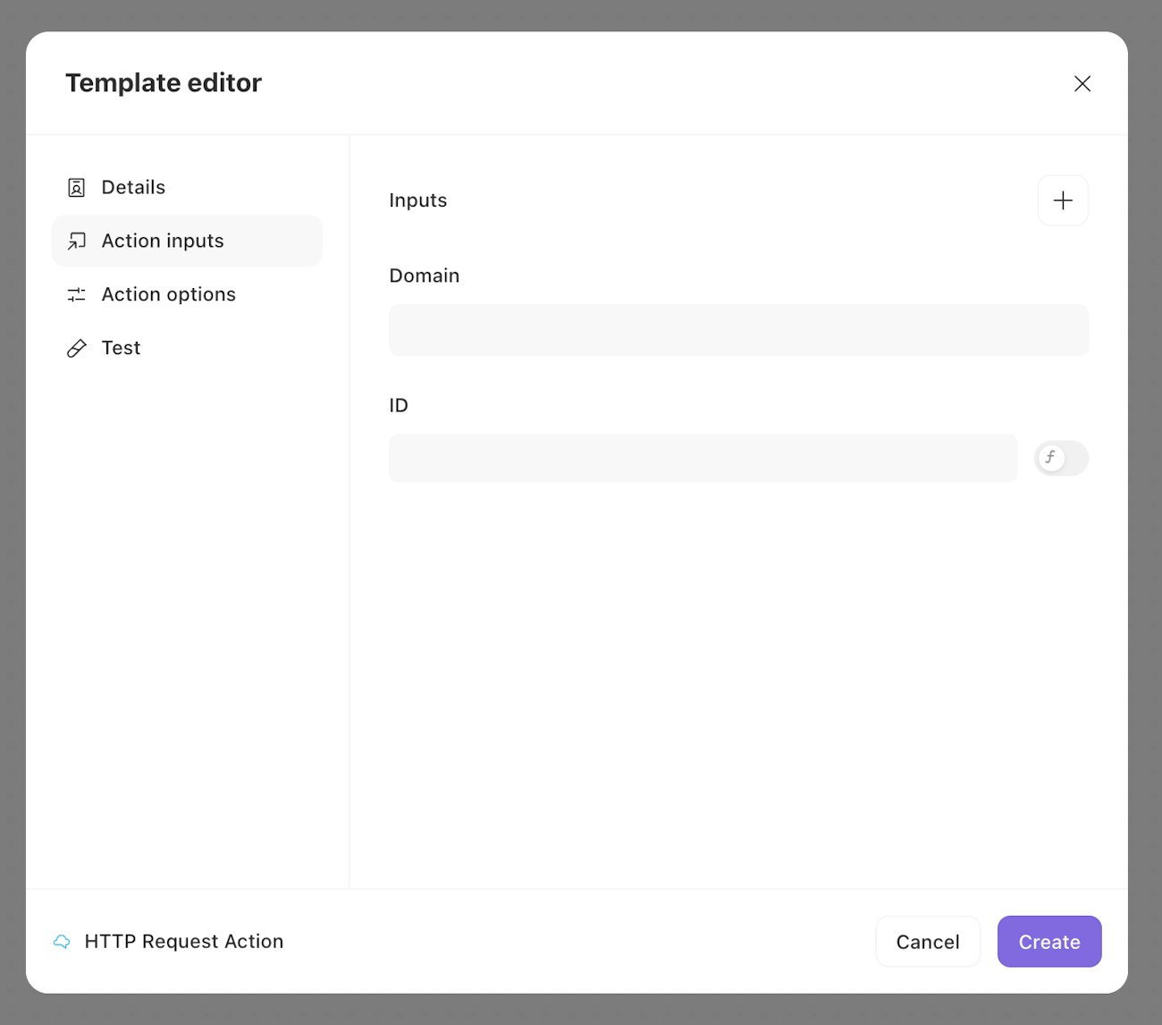To create a private template, select any action from any story and then select Create template from the more dropdown to open the template editor. The editor will autofill any information from the selected template and is broken up into four sections: Details, Action inputs, Action options and Test.